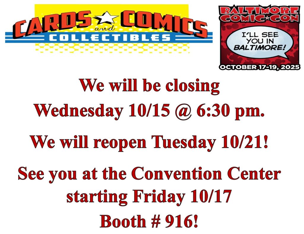 BALTIMORE COMIC-CON October 14, 2025 Marc News We will be closing Wednesday 10/15 @ 6:30 pm. We will reopen Tuesday 10/21! See you at the Convention Center starting Friday 10/17 Booth # 916! Share This Twitter Facebook LinkedIn Email Marc Related Posts WEEKEND SALE ! FRI. – SUN.: OCT. 3 – 5! WEEKEND SALE ! FRI. - SUN.: OCT. 3 – 5! 50% OFF: PAPERBACKS, HARDCOVERS, MANGA,… WEEKEND SALE ! FRI. – SUN.: SEPT. 26 – 28! WEEKEND SALE ! FRI. - SUN.: SEPT. 26 - 28! 50% OFF: PAPERBACKS, HARDCOVERS, MANGA,… WEEKEND SALE ! FRI. – SUN.: SEPT. 12 – 14! WEEKEND SALE ! FRI. - SUN.: SEPT. 12 - 14! 50% OFF: PAPERBACKS, HARDCOVERS, MANGA,…