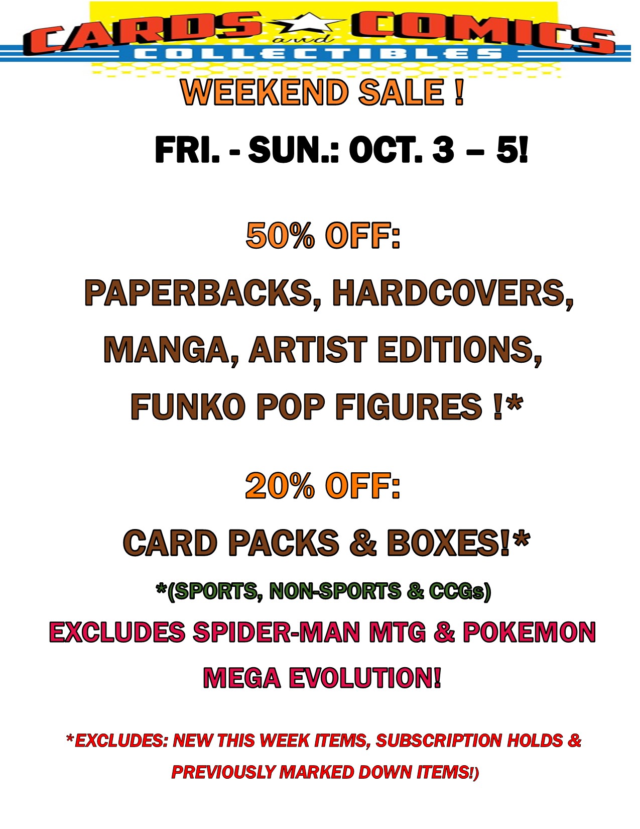 WEEKEND SALE ! FRI. - SUN.: SEPT. 26 - 28! 50% OFF: PAPERBACKS, HARDCOVERS, MANGA,…