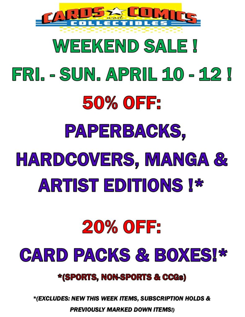 WEEKEND SALE ! FRI. – SUN. APRIL 10 – 12 ! April 8, 2026 Marc News WEEKEND SALE ! FRI. – SUN. APRIL 10 – 12 ! 50% OFF: PAPERBACKS, HARDCOVERS, MANGA & ARTIST EDITIONS !* 20% OFF: CARD PACKS & BOXES!* *(SPORTS, NON-SPORTS & CCGs) *(EXCLUDES: NEW THIS WEEK ITEMS, SUBSCRIPTION HOLDS & PREVIOUSLY MARKED DOWN ITEMS!) Share This Twitter Facebook LinkedIn Email Marc Related Posts EASTER SALE: WEDNESDAY APRIL 1ST– SUNDAY APRIL 5TH EASTER SALE! WEDNESDAY APRIL 1ST– SUNDAY APRIL 5TH 70% OFF: MODERN COMICS BACK ISSUES! 50%… WEEKEND SALE! FRI. – SUN. MARCH 20 – 22 ! WEEKEND SALE ! FRI. - SUN. MARCH 20 - 22 ! 50% OFF: PAPERBACKS, HARDCOVERS,… WEEKEND SALE ! FRI. – SUN. MARCH 13 – 15 ! WEEKEND SALE ! FRI. - SUN. MARCH 13 - 15 ! 50% OFF: PAPERBACKS, HARDCOVERS,…